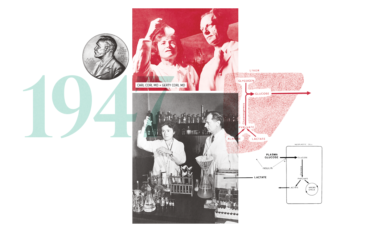 Carl Cori, MD, and Gerty Cori, MD, arrived at WashU Medicine in 1931 with a radical vision: to uncover how the body converts glycogen — its stored form of sugar — into glucose, the fuel that powers cells. Their discovery of this catalytic process, now known as the Cori Cycle, earned them the Nobel Prize in Physiology or Medicine in 1947.